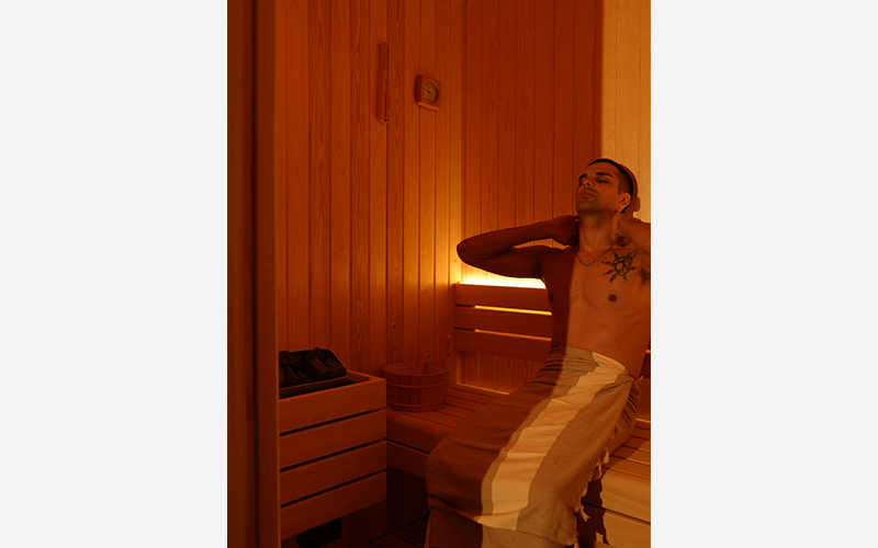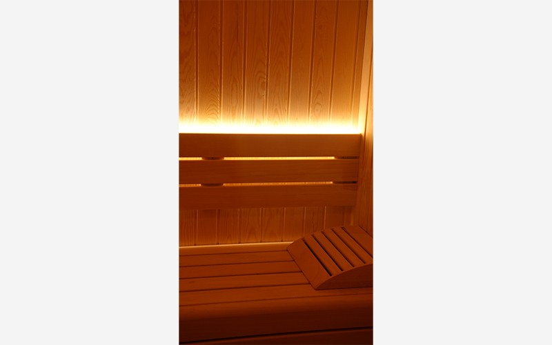 Projede Sauna Akdeniz çamı lambri duvar ve tavanda, oturma ve zeminde Abachi Ağacı deck ile kaplanmıştır. 8mm temperli cam kanatlı abachi kasalı cam kapı uygulanmıştır.